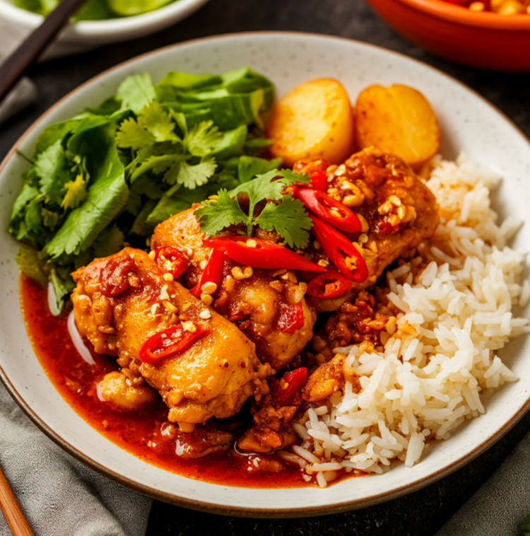 Приготовим ароматную и пикантную курицу по-тайски – блюдо, которое перенесет вас в атмосферу восточной кухни! Для начала нарезаем 400 г куриного филе небольшими кубиками или полосками. В миске смешиваем нарезанное куриное филе с 1 столовой ложкой соевого соуса, 3 щепотками молотого чили и 3 щепотками черного молотого перца. Тщательно перемешиваем и оставляем мариноваться на 15-20 минут. Красный сладкий перец (1 шт) очищаем от семян и нарезаем кубиками или полосками. Очищаем небольшой кусочек имбиря (примерно 1 см) и натираем на мелкой терке или мелко нарезаем. Очищаем 2 зубчика чеснока и измельчаем. В сковороде разогреваем 60 мл растительного масла. Выкладываем в сковороду замаринованное куриное филе и обжариваем на среднем огне до золотистого цвета. Добавляем к курице нарезанный сладкий перец, измельченный имбирь и чеснок. Обжариваем все вместе еще 5-7 минут, помешивая, пока перец не станет мягким. Добавляем соль по вкусу, если необходимо (соевый соус уже достаточно соленый). Курица п