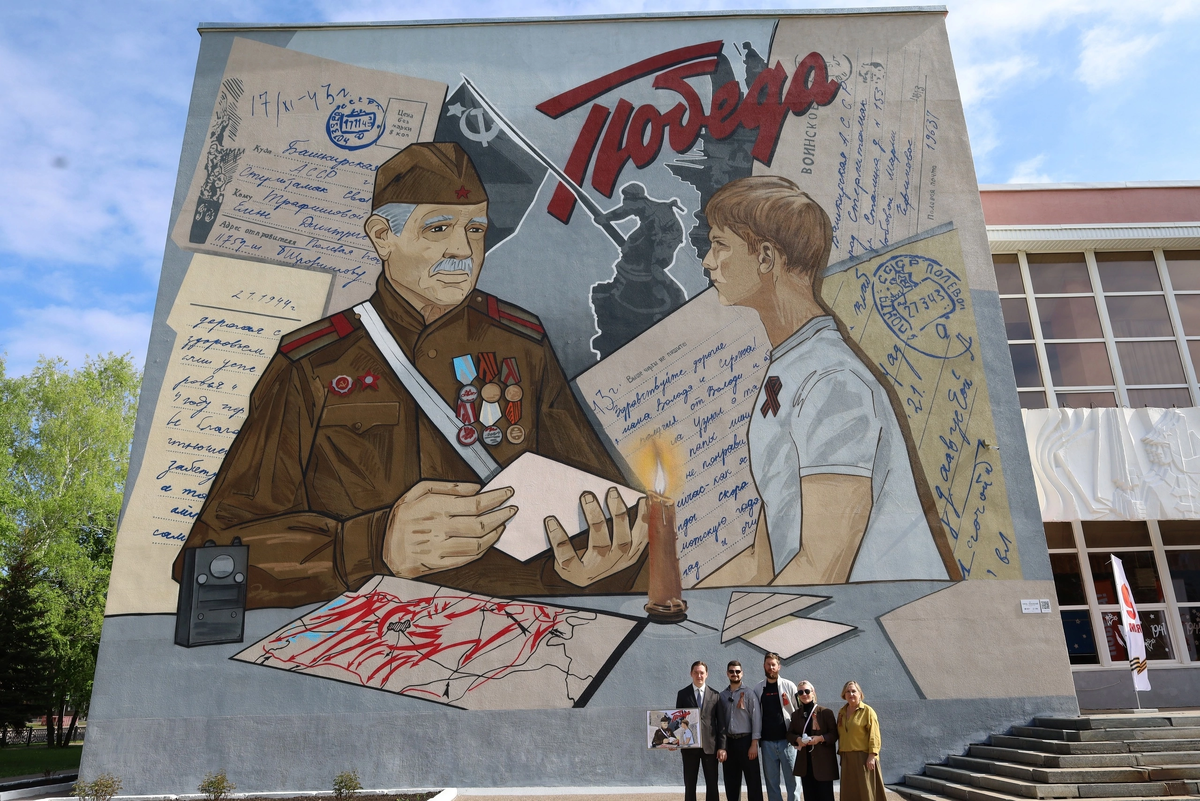Всего за три дня на фасаде Дворца пионеров и школьников имени А.П. Гайдара появился новый мурал «Связь поколений» — настоящий рекорд по скорости исполнения! К созданию патриотического арт-объекта, приуроченного ко Дню Победы, приступила команда проекта «Страна героев» при поддержке Башкирской генерирующей компании. Работы проходили под руководством Михаила Богатыренко при содействии Отдела по молодёжной политике Стерлитамака. Автором рисунка стал один из ведущих художников-муралистов страны — Алексей Таракин. В процессе разработки концепции команда проекта сотрудничала со Стерлитамакским историко-краеведческим музеем. Благодаря этому в композицию были включены подлинные солдатские письма времён Великой Отечественной войны из музейного архива. По информации Отдела по молодежной политике