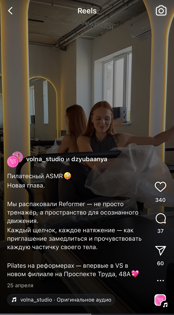 Студия растяжки Volna устроили ASMR-анпакинг тренажера для пилатеса и подробнее рассказала об устройстве в описании. Цель — показать, что у них появился этот тренажер, что само по себе уже — конкурентное преимущество, поскольку большинство студий пилатеса занимаются по-старинке. А такие тренажеры — это та самая эстетика пилатеса из Pinterest. И студии, у которых они есть, можно пересчитать по пальцам.