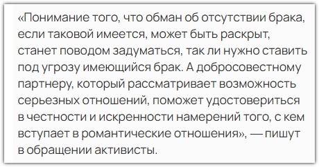 Общественный центр "Сорок сороков" предложил окультурить сайты знакомств, снабдив их фильтрами, подтягивающими данные с официальных Госуслуг. В частности, сделать обязательной авторизацию и отмечать там женатиков и замужних дам, решивших инкогнито гульнуть. Функция должна шикарно работать. Потенциальные женихи и невесты смогут заранее отсечь тех, кто уже занят и не тратить время и себя на неподходящий вариант. А подозреваки смогут пробить свою половинку на предмет того, как тусуется ли он на сайте и скрывает ли, что уже счастливо женат/любящая жена и мать прекрасных деточек. По мнению активистов, это поможет снизить число супружеских измен (мы же все знаем, что любовников ищут именно на сайте знакомств, а не где-то ещё). Вот решит человек гульнуть - а низзя, он на сайте с "чёрной меткой". Придётся быть верным и любить только действующего супруга, а не каких-то там, с сайтов знакомств. Для этого потребуется всего лишь один простой советский... реестр граждан, состоящих в браке. Чтобы