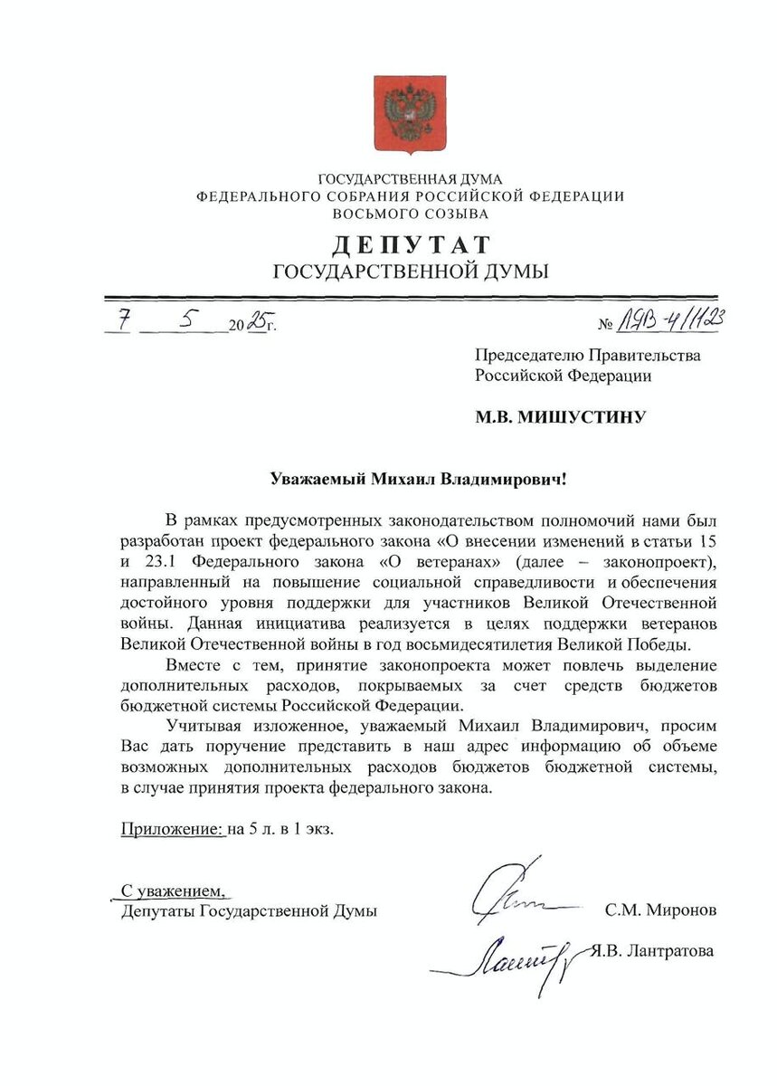 Ежемесячные выплаты ветеранам Великой Отечественной войны нужно увеличить вдвое. Кроме того, мы предлагаем полностью освободить их от расходов на ЖКХ и взносы на капремонт. Вместе с руководителем фракции СРЗП Сергеем Мироновым подготовили законопроект и направили его на рассмотрение премьер-министру Михаилу Мишустину. ⚠️За последние 10 лет инфляция «съела» почти половину покупательной способности тех выплат, которые получают ветераны. А ведь эти люди отдали всё ради нашей свободы. Мы обязаны сделать так, чтобы они могли жить достойно, не думая о том, как свести концы с концами. Что мы предлагаем? 1️⃣ Увеличить выплаты вдвое — чтобы ветераны могли спокойно покупать лекарства, продукты и другие необходимые вещи. 2️⃣ Полностью компенсировать расходы на ЖКХ и капремонт — наши дорогие ветераны Великой Отечественной войны не должны переживать из-за счетов за коммунальные услуги. 3️⃣ Уточнить правила выплат компенсаций за жилищно-коммунальные услуги и взносы на капремонт для членов семей в