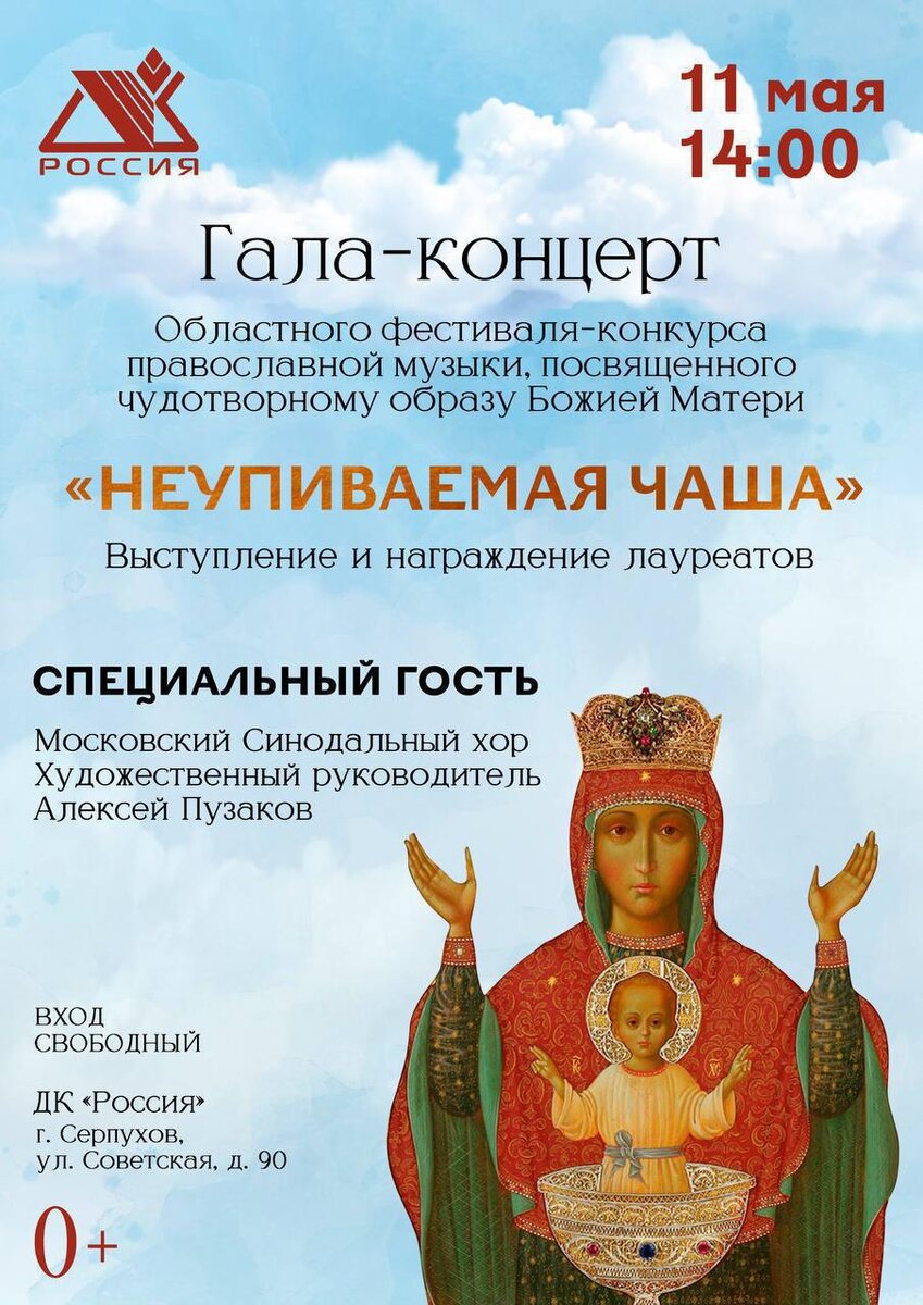 ➡️Во Дворце культуры «Россия» состоится Гала-концерт победителей Московского Областного фестиваля-конкурса православной музыки, посвященный чудотворному образу Божией Матери «Неупиваемая Чаша». 👥В нем примут участие лауреаты конкурса и приглашенные гости – Московский Синодальный хор под руководством Алексея Пузакова. 📌Мероприятие пройдёт 11 мая в 14:00. ❗️Вход свободный!