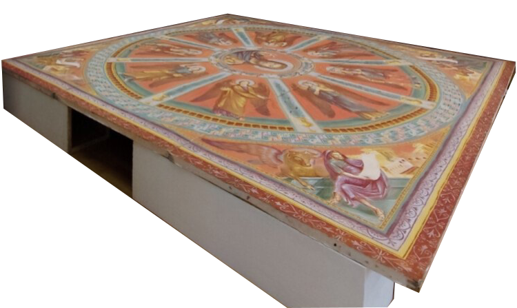В центре зала, на подиуме высотой сантиметров сорок, покоится огромное панно на православные темы. В центре панно – изображение Христа, по кругу лучами расходятся изображения ангелов. О панно оперлась женская ножка, а на панно складками лежит женский подол...