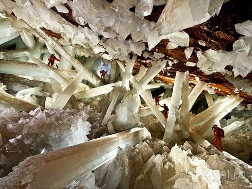 В глубинах мексиканской шахты Найка, на глубине 300 метров под землей, была обнаружена, пожалуй, самая фантастическая пещера в мире — Пещера кристаллов или Cueva de los Cristales. Это место, которое выглядит как портал в иной мир, содержит гигантские кристаллы селенита (разновидность гипса), достигающие 11 метров в длину и весом до 55 тонн. Кристаллы настолько велики, что люди рядом с ними выглядят как муравьи на фоне исполинских деревьев.