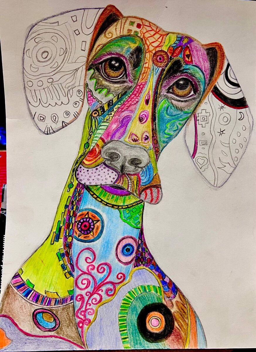 Еще немножко 🤏-и собака будет готова😊Уши,фон, подкорректировать чуток некоторые переходы и работа с линерами, которым дети,как оказалось,приделали ноги🤨Стиль зентангл очень творческий и похож на жизнь,рисовать внутри контуров и раскрашивать можешь,что хочешь и как хочешь,но результат мб неожиданным🤭😀