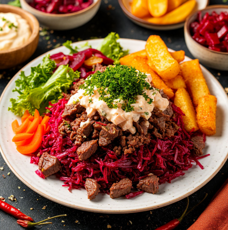 Приготовим яркий и вкусный салат “Чафан” – популярное блюдо, которое сочетает в себе сочные овощи и нежное мясо! Для начала подготовим ингредиенты: 200 г говядины отвариваем до готовности, затем остужаем и нарезаем тонкой соломкой. 2 картофеля очищаем и нарезаем тонкой соломкой. 300 г белокочанной капусты тонко шинкуем. 1 морковь и 1 свеклу натираем на терке для корейской моркови или нарезаем тонкой соломкой. 1 репчатый лук нарезаем тонкими полукольцами. Обжариваем картофель в растительном масле до золотистой корочки. В глубокой миске смешиваем капусту, морковь, свеклу и лук. Добавляем к овощам обжаренный картофель и нарезанную говядину. Готовим заправку: в отдельной миске смешиваем 4 столовые ложки растительного масла, 50 мл уксуса 3% (или лимонного сока), измельченный чеснок (2 дольки), соль и перец по вкусу. Заправляем салат приготовленной заправкой и тщательно перемешиваем. Добавляем мелко нарезанную зелень (петрушку, укроп) и перемешиваем еще раз. Даем салату настояться 15-20 мину