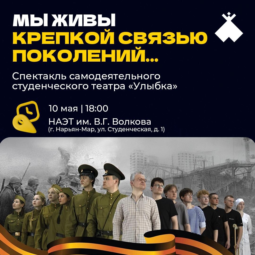Народный самодеятельный студенческий театр «Улыбка» приглашает жителей и гостей Нарьян-Мара на премьеру спектакля, посвященного Великой Отечественной войне.