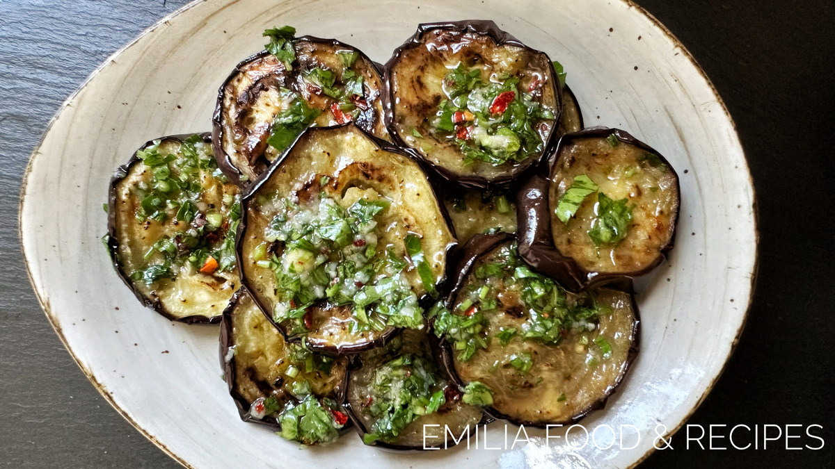 Друзья, добрый день! Сегодня предлагаю приготовить очень вкусные баклажаны. Точнее сказать, это будет закуска из итальянской кухни! Это блюдо на итальянском называется Melanzane grigliate sott’olio. И я очень рекомендую его приготовить и попробовать. Для этого рецепта мне понадобятся три баклажана. Лучше брать плотные тонкие баклажаны, в которых не очень много семян. Баклажаны хорошо мою. Чистить их не нужно. Нарезаю на кружочки толщиной примерно 5 мм. Раскладываю баклажаны на доске в один слой. Кстати лучше сразу все баклажаны не нарезать. Порезали один, подготовили, и пока он жарится, нарезаем следующий. Щедро смазываю хорошим оливковым маслом. и присыпаю солью.. Теперь переворачиваю баклажаны.. и проделываю все тоже самое с другой стороны. Обжариваю баклажаны на сухой сковороде. Затем выкладываю их на бумажное полотенце. Пока баклажаны жарятся, нарезаю следующую партию. Когда все баклажаны обжарятся, начинаю готовить заправку. Очень мелко нарезаю петрушку. Для заправки