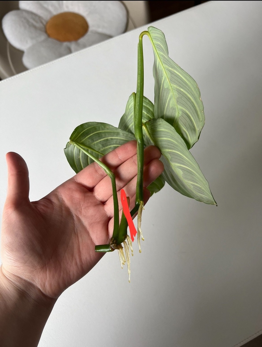 Здравствуйте! У меня два вопроса по маранте: 1) можно ли разделить этот черенок на два, чтобы было два растения в итоге (красным показала место разреза) или не следует? 2) готов ли такой черенок к посадке в горшок? Или дать ему ещё нарастить корни? Большое спасибо всем, кто откликнется. И отдельно - админам группы за работу. 🙏🏼