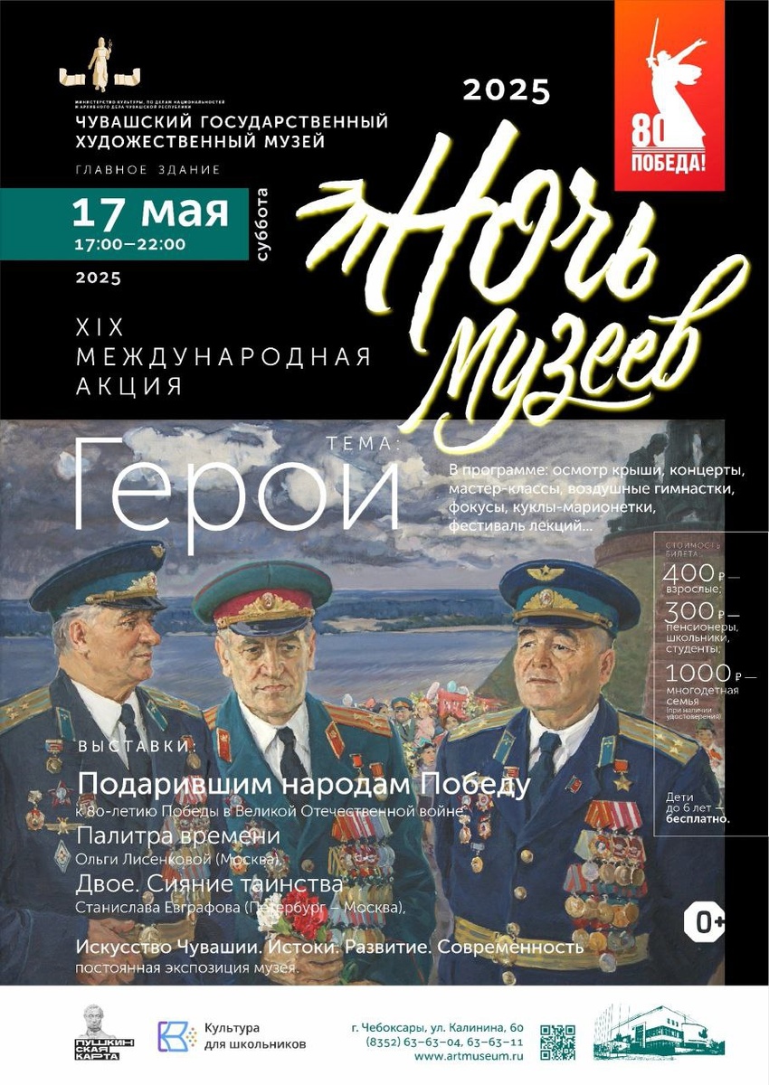 Отгремели юбилейные салюты 80-летия ПОБЕДЫ! Но её ГЕРОИ ждут внимания зрителей! 🌘Приглашаем на "Ночь музеев"!🌙 17 мая с 17 до 22 часов! 17-20 часов - "Музей: сверху до низу" - осматриваем музейную крышу и загадочный подвал. Концертная программа: 18-19 часов - Оркестр играет Мелодии Победы. 19-19:30 часов - Воздушные гимнастки. 19:30-20:30 часов - "Победа за нами!" - вокалисты ЧГИКИ с победным репертуаром. 20:30-21:00 - Фокусы. Нон-стопом с 18 до 21 ч.: Куклы-марионетки Вито ; Фестиваль Лектория по пятницам; Курс молодого бойца с ВИК Русский Егерь; Мастер-классы с научными сотрудниками Художественного музея. Выставки: "Подарившим народам Победу!" - живопись, графика, фото из коллекции ЧГХМ; "От Шемурши до Кёнигсберга" - фото из военного альбома старшины А.Коновалова; "Этих дней не смолкнет слава" - победители Конкурса детского рисунка имени Э.М.Юрьева; "Он не вернулся из боя.." - живопись Александра Фёдорова (позывной "Зодчий"). ⚡️Доступна Пушкинская карта: vmuzey.com/event/noc