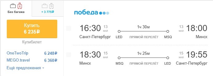 ✈️Санкт-Петербург - Минск (Беларусь), туда и обратно за 6250 рублей