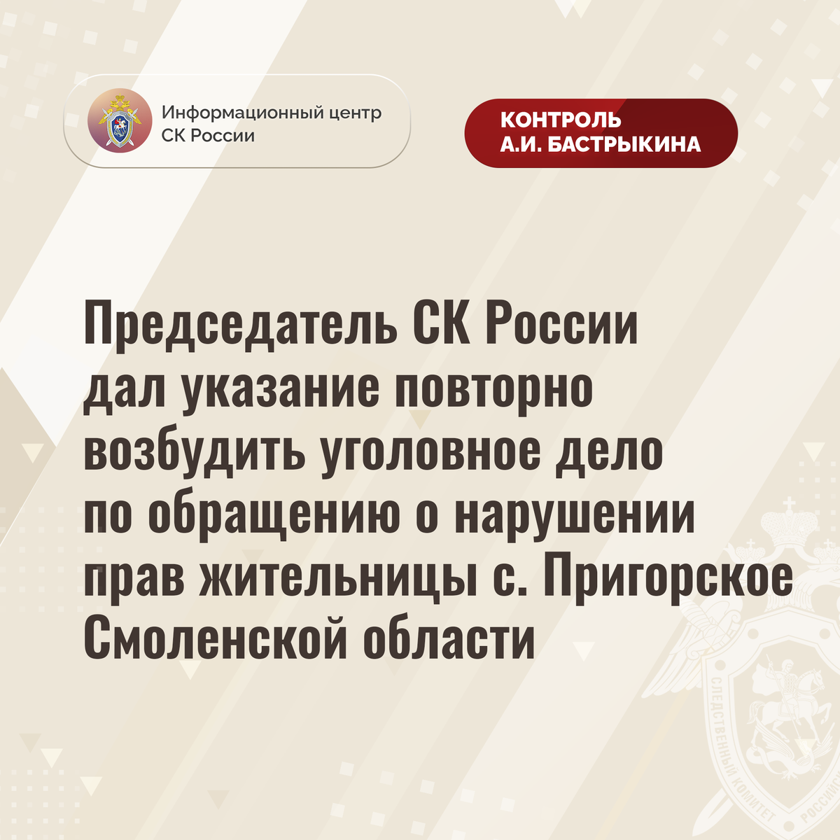 Председатель СК России дал указание повторно возбудить уголовное дело по обращению о нарушении прав жительницы с. Пригорское
