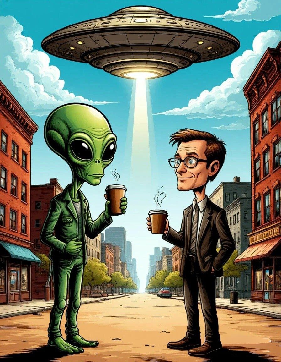 "Главное — не ляпни что-то дурацкое. Это же первый контакт. История. На века. Как Гагарин… только без подготовки." А он, наверное, думает: