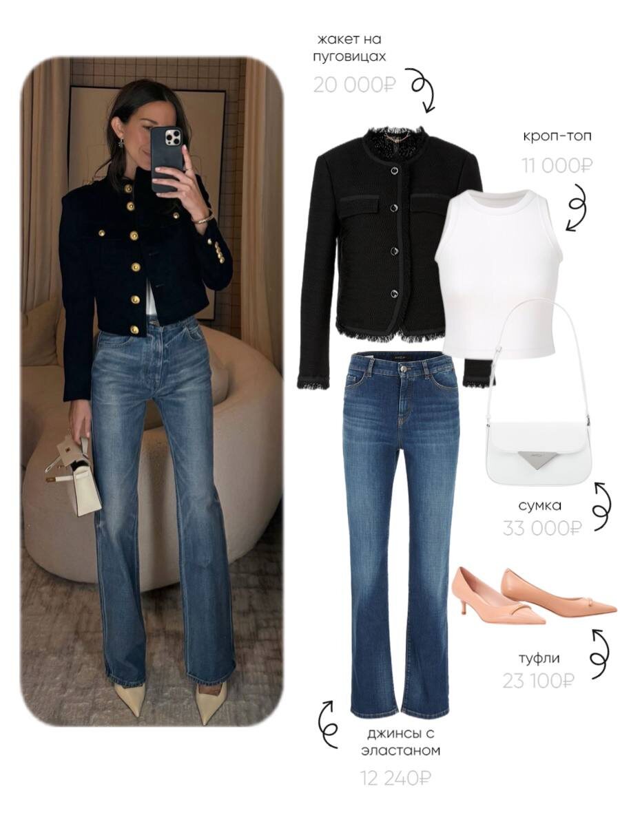 Повторяем образ из Pinterest 🤍 Укороченный жакет в стиле милитари придаёт образу строгость и изысканность. Базовый белый топ, создаёт контраст с тёмным жакетом. Прямые джинсы синего цвета, слегка расклешённые книзу, подчёркивают фигуру и придают образу расслабленность. Нюдовые лодочки с острым носом на невысоком каблуке — женственные и универсальные. Белая минималистичная сумка, завершает образ и гармонирует с кроп-топом. Образ прекрасно подойдёт как для дневных мероприятий, так и для вечернего выхода.