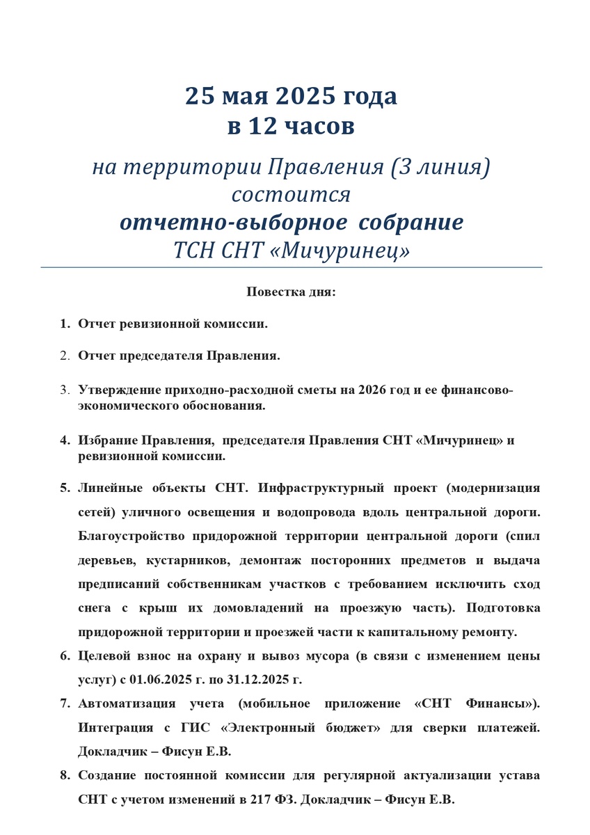 Объявление об отчетно выборном собрание ТСН СНТ «Мичуринец».