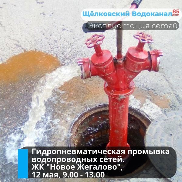 Гидропневматическая промывка сетей холодного водоснабжения в Щёлково Щёлковский водоканал приступает к сезонной промывке сетей холодного водоснабжения в городском округе Щелково. 12 мая с 9.00 до 13.00 водопроводная служба промоет уличные сети в микрорайоне Жегалово, ЖК Новое Жегалово. Гидропневматическая промывка предусматривает использование компрессора для создания газовоздушной смеси, которая эффективно снижает отложения со стенок трубопровода. Во время промывки возможно снижение давления холодной воды, а также появление мутности.