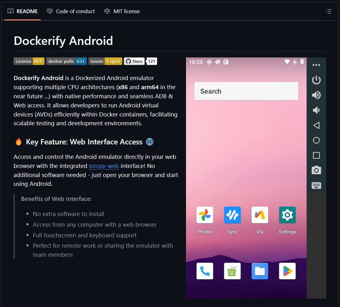 Dockerify Android: эмулятор Android в Docker🔥 Тулза для всех, кто занимается Android-разработкой. Она упрощает создание тестовых сред за счёт контейнеризации и обеспечивает доступ через веб-интерфейс scrcpy-web. Так что дополнительное ПО ставить не придётся. Просто открывайте scrcpy-web интерфейс и сразу работайте с Android с любого устройства на котором есть браузер. Эмулятор предоставляет root-доступ, предустановленные PICO GAPPS, зеркалирование экрана и ускоренную производительность благодаря KVM. #инструменты