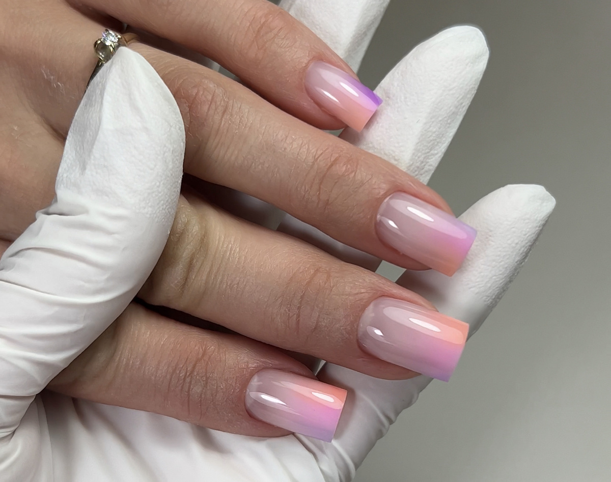 Необходимые материалы: — Молочный гель (не слишком пигментированный); — Несколько цветов ярких неоновых пигментов; — Камуфлирующий гель или база любого оттенка. Шаг 1. Ставим три большие капли молочного геля на палитру. Шаг 2. В каждую каплю добавляем цветной пигмент и хорошенько смешиваем до однородной консистенции. 🔥 Важно! Пропорция смеси должна быть примерно такой: — 90–95% молочного геля; — всего лишь 5–10% яркого неонового пигмента. Для того, чтобы эта смесь хорошо просохла в лампе. Теперь наши цветные гели готовы к нанесению! Шаг 3. Далее выкладываем эти смеси на торец ногтя или же в верхнюю форму. Так как моей клиентке нужно было сменить овальную форму на квадратную, то быстрее всего это можно сделать с помощью верних форм. Я немного подрезана форму (срезала зону апекса ) , нанесла гель и отпечатала на ноготь. Шаг 4. Проходимся бафом по поверхности геля, убираем глянец и подпиливаем торец. Шаг 5. Ставим небольшую каплю камуфлирующего геля у кути