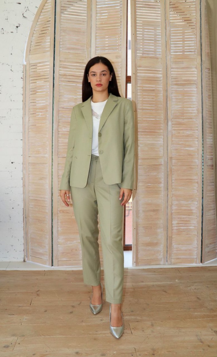 Оливковый стильный дизайнерский костюм. Незаменим круглый год.