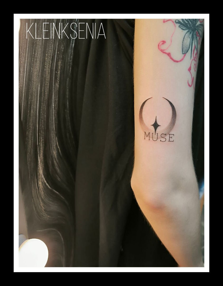 Нежная тату в виде полумесяца, мерцающей звёздочки и загадочной надписи "Muse" — это больше, чем просто рисунок. Это символ вдохновения, тайны и внутреннего света! 🌟