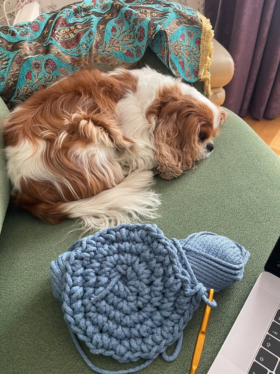 Новый коврик для Джесси . Раз в полгода я открываю урок для вязания крючком и начинаю вязать новый коврик . Коврик лежит на кухне и Джесси грызет на нем косточки и вкусняшки . Коврики пачкаются , стираются , а потом выбрасываются . Скоро мне эта возня надоест и я просто буду их покупать . Но пока у меня ещё есть запасы толстого шнура , я обновляю их собственноручно .