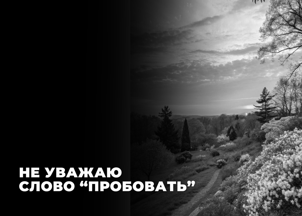Что значит попробовать? Сделать «чуть-чуть»? Как попало? В пол силы? На «черновичок»? Поиграть в результат? Что? ⠀ «Давайте попробуем встать со стула»… вот представьте… пробовать встать со стула. Это будет выглядеть как «прыгать на жопе» ⠀ Мы или встаем, или сидим. Или мы имеем намерение встать нормально. Качественно. Не пробуем. А встаем. Если не получилось-то встаем еще раз. Но с намерением встать, а не пробовать. ⠀ Понимаете? ⠀ Потому что пока мы пробуем, мы тратим настоящее время, которое не возобновиться, которое нам никто не вернет с неудачных попыток, которое мы потом не купим и не украдем. ⠀ Потому для меня лично критически важно делать сразу хорошо. ⠀ -Не пробовать поучиться, а брать максимум с этой учебы. ⠀ -Не пробовать строить отношения, а быть одной до тех пор, пока не появится партнер, который будет мне реально интересен. Сразу слышать себя, если внутри «не хочу», то и не тратить время. ⠀ -Не пробовать жить вместе, а строить совместную счастливую жизнь сразу, бережно отно