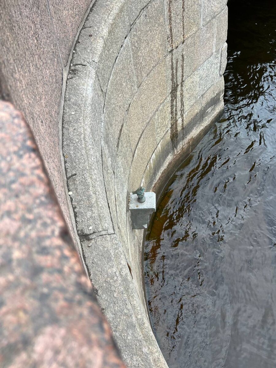 Скульптура крошечная: всего 11 сантиметров в высоту и около 5 килограммов. Стоит прямо на гранитной подпорной стенке Фонтанки. Не на мосту, не на перилах — а почти у самой воды. Увидеть его можно, только если специально подойти к краю. Или — что делают самые упорные — прицелиться монеткой и попытаться попасть на пьедестал (считается, если попадёшь — будет исполнится желание).