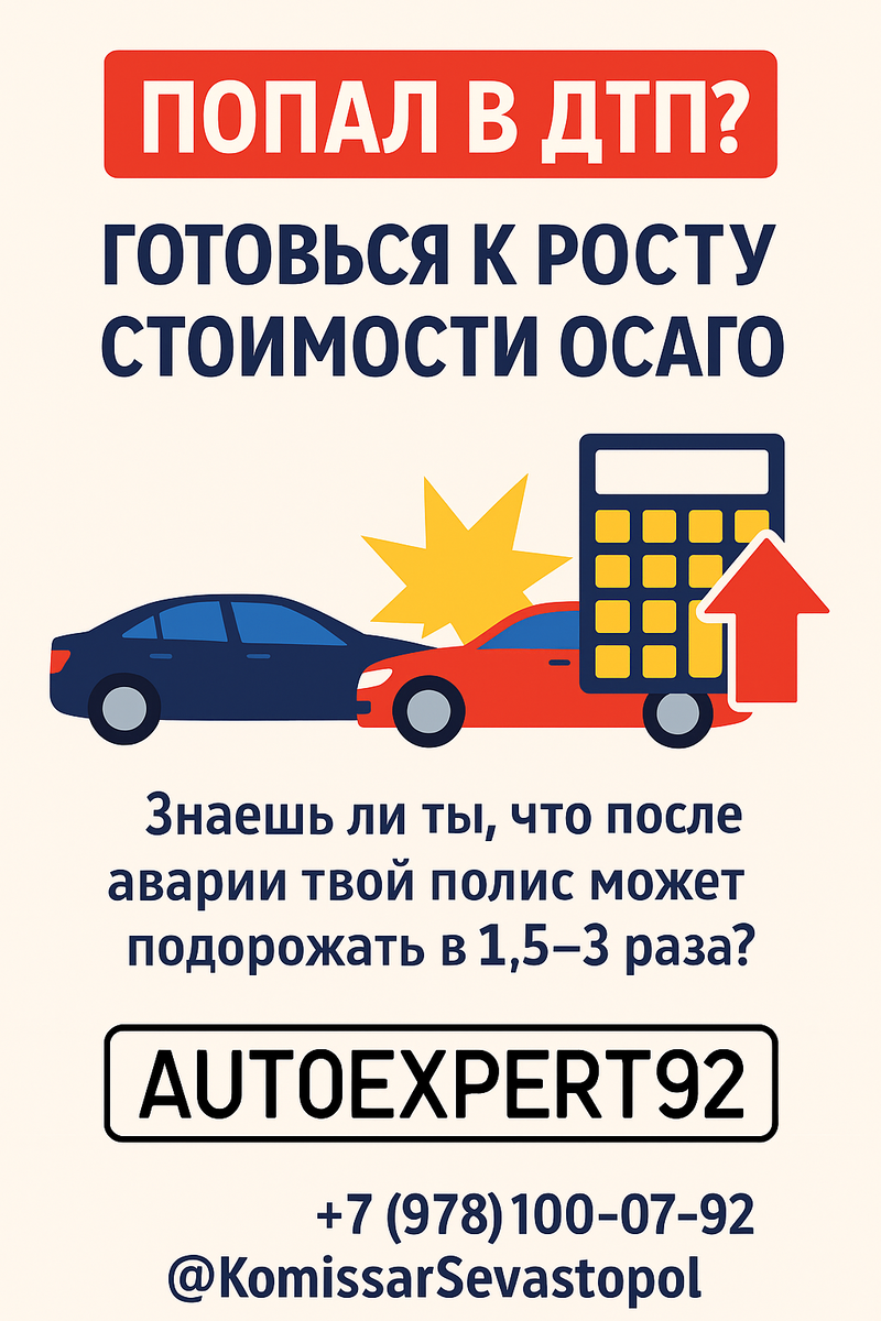 📈 Попал в ДТП? Готовься к росту стоимости ОСАГО Знаешь ли ты, что после аварии твой полис ОСАГО может подорожать в 1.5–3 раза? И дело тут в коэффициенте бонус-малус (КБМ). ⸻ Что это такое? КБМ — это система скидок и надбавок к стоимости ОСАГО. Если ездишь аккуратно — получаешь скидку. Если попал в ДТП и признан виновником — КБМ обнуляется или даже уходит в минус. ⸻ Пример: • До ДТП твой КБМ = 0.5 → скидка 50% • После одного виновного ДТП = 1.55 → базовая ставка увеличивается на 55% • После двух аварий за год — можешь получить КБМ 2.45 и платить в 2.5 раза дороже! ⸻ Что делать, чтобы не переплачивать? 1. Не соглашайся с виной, если не уверен — вызывай комиссара и оформляй всё грамотно. 2. Проверяй КБМ 3. Оформляй ДТП по европротоколу, если можно — страховые чаще не списывают КБМ при отсутствии тяжёлого ущерба. 4. Сохраняй все документы — пригодятся при споре. ⸻ Попал в ДТП? Поможем оформить всё правильно и защитим твой КБМ. AutoExpert92 — аварийный комиссар Севастополь 📞 +7