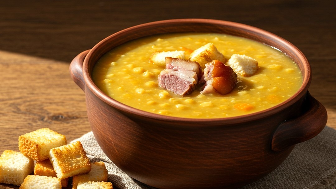 🍲 Рецепт 1: Классический гороховый суп с копчёной рулькой и сухариками