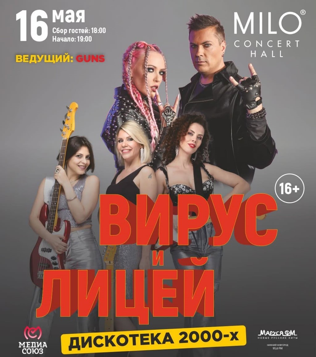 16 мая — Вирус и Лицей. Дискотека 00-х в Milo Concert Hall! Дискотека 2000-х — это увлекательный, полный приятной музыкальной ностальгии полет в мир любимой музыки нулевых и настоящий марафон самых дорогих сердцу песен, которые знает вся страна. Будут самые горячие хиты, которые ты точно знаешь наизусть: «Попрошу тебя», «Ты меня не ищи», «Ручки», «У меня есть счастье», «Братишка», «Всё пройдёт», «Девчонка» от группы “ВИРУС”. Любимые хиты твоей юности от Насти Макаревич и группы “ЛИЦЕЙ” — “Осень”, “Ты станешь взрослой”, “Как ты о нём мечтала” и другие на расстоянии вытянутой руки. Для вас споют артисты, чьи треки ставили на каждой дискотеке 2000-х, чьи названия вызывают доброе чувство ностальгии, чьи тексты мы знаем наизусть и будем петь и танцевать всем залом. #яместный
