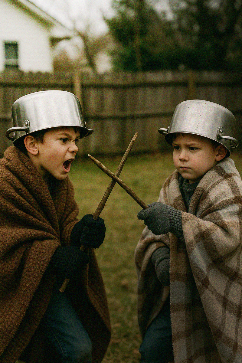 Потому что в их голове это был именно такой эпос. Два мальчика в полном латном обмундировании, лица напряжённые, зубы стиснуты, мечи скрещены — и видно, что они не отступят.