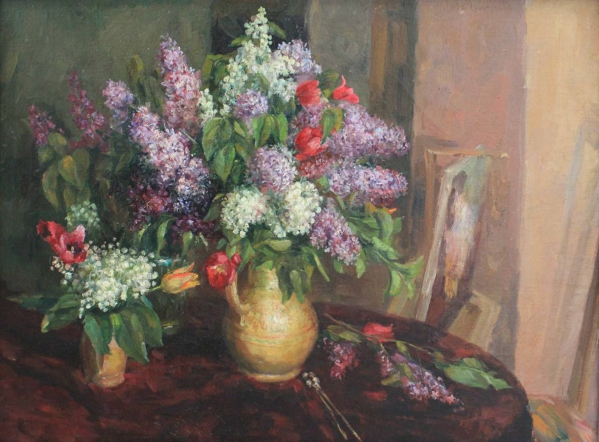 #весны_чарующая_сила 🪷Нередко сирень становится гостем на весенних натюрмортах художников, ведь этот цветок передает не только радость весеннего пробуждения природы, но и ассоциируется с праздником Великой Победы. 🌿На картине «Сирень. Натюрморт», написанной художником Н.М. Скоробогатовым, изображен букет сирени в вазе, удивительным образом привлекающий внимание своей яркостью и разнообразием оттенков. В центре композиции находятся сиреневые и белые цветы, которые создают ощущение свежести и легкости. Вокруг них расположены красные тюльпаны, добавляющие контраст и глубину изображению. «Сирень. Натюрморт» (середина ХХ века) Н.М. Скоробогатов Холст, масло Из собрания ТХМ.