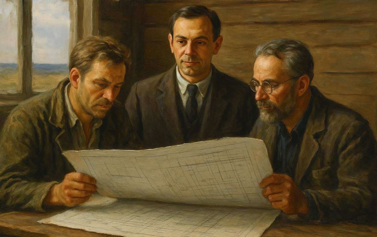 Сегодня на стройку приехал представитель из Москвы — Андрей Ильич Петров, старший научный сотрудник ЦАГИ. Он привез окончательные чертежи башни, утвержденные лично Шуховым. Мы с Николаевым и Громовым долго их изучали.