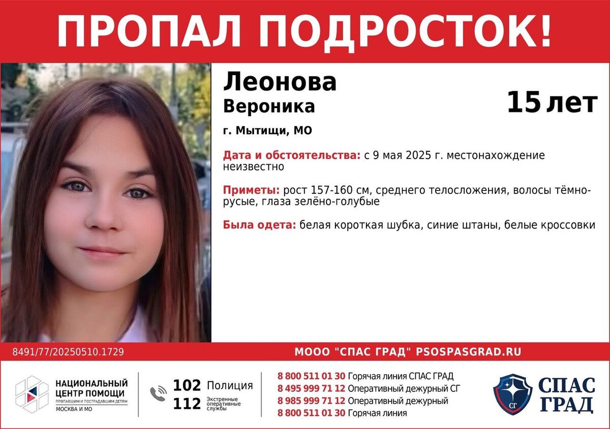 ✅ ДЕВОЧКА НАЙДЕНА! ДОМА. 🔴 ПРОПАЛА ДЕВОЧКА ‼️ ▪️ЛЕОНОВА ВЕРОНИКА, 15 ЛЕТ, Г.О. МЫТИЩИ ➡️9 мая Вероника ушла из дома в Мытищах и не вернулась. ▪️Приметы: рост 157–160 см, среднего телосложения, волосы тёмно-русые, глаза зелёно-голубые. ▪️Была одета: белая короткая шубка, синие штаны, белые кроссовки. ‼️ Просим вас максимально распространить информацию, чтобы помочь найти Веронику и вернуть её домой. Не поленитесь сделать репост в ваши домовые и школьные чаты. Каждый репост может стать решающим шагом в поиске! 🙏 📣 Если вы что-то знаете, если вы видели девочку, пожалуйста, свяжитесь по телефону: • 8 (926) 050-88-30 — Людмила • 8 (925) 125-67-28 — Наталья ❤️ @mytischi_live