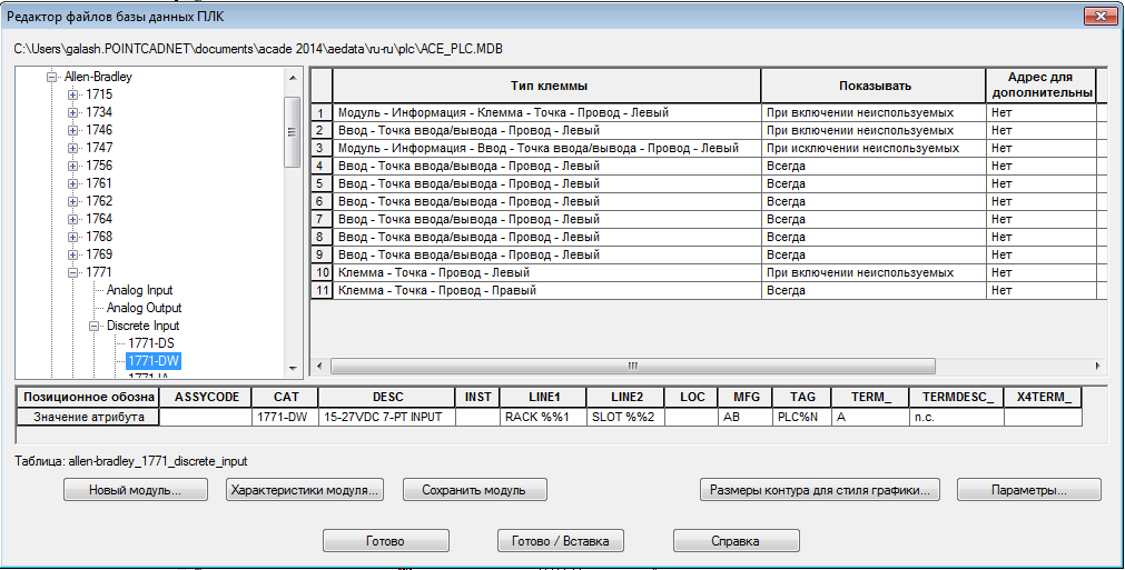 Кнопки в нижней части диалогового окна «Редактор файлов базы данных ПЛК» выполняют следующие функции: · Новый модуль - Создание и включение нового модуля параметрического ПЛК в базу данных. · Нажатием кнопки Характеристики модуля открывается одноименное диалоговое окно, которое предназначено для изменения ранее введенных данных для модуля ПЛК в диалоговом окне «Новый модуль». Поля «Изготовитель», «Серия», «Тип серии», «Код» и «Клеммы» не активны, так как они зависят от положения модуля в древовидной структуре базы данных, а общее количество клемм указано в таблице клемм. · Кнопка Сохранить модуль - Сохранение внесенных в диалоговом окне изменений. · Нажатием кнопки Размеры контура для стиля графики открывается одноименное диалоговое окно, в котором кроме задания размеров контура модуля ПЛК, также назначается стиль графического отображения модуля ПЛК по умолчанию. Размеры по умолчанию для выбранного стиля графики используется, если в полях диалогового окна «Размеры рамки модуля» не зада