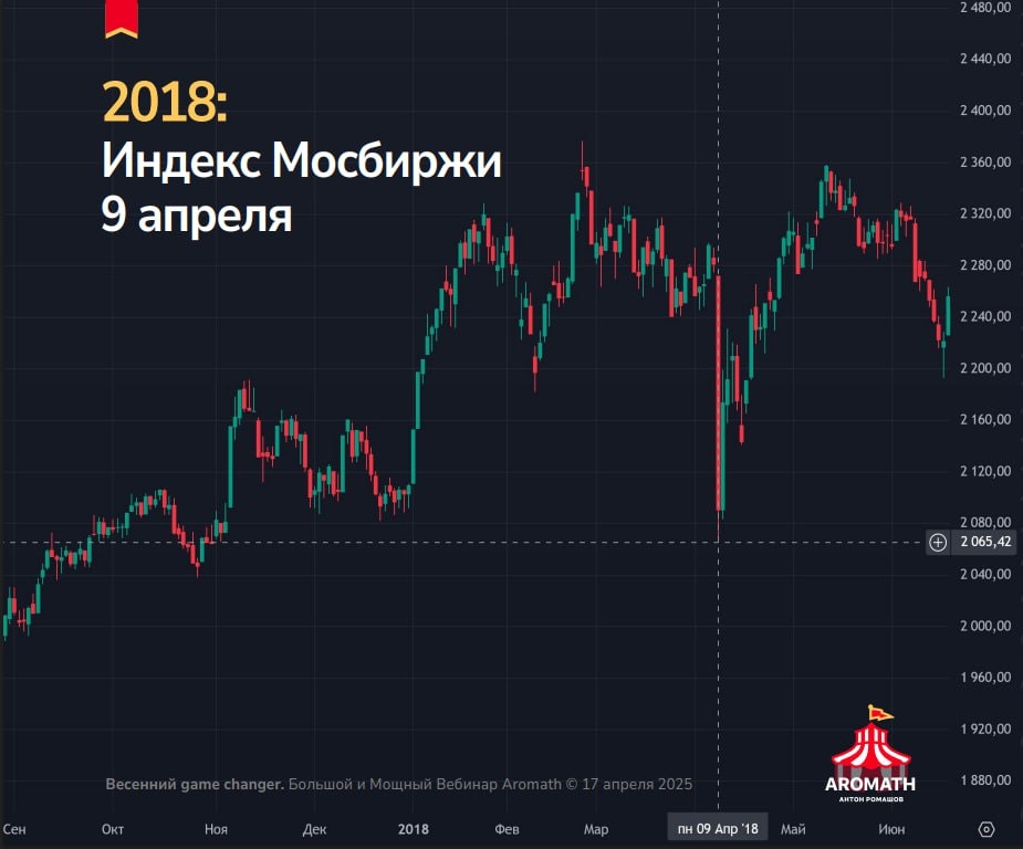 Уроки из жизни Aromath🎪: флеш-крэш 9 апреля 2018 года Вернёмся ненадолго назад — ведь один из принципом "Фундаментального психотрейдинга Aromath🎓" — все повторится вновь и вновь - карусель вечная🎡. 9 апреля 2018 года, понедельник — первые санкции SDN против российского бизнеса, конкретно против компании «Русал». Тогда это было немыслимо. Никто не понимал, что это такое санкции. Никто не мог даже предположить, что затем санкции введут даже на Сбербанк, а потом и на многие другие российский компании. Тогда невозможно было даже подумать, что SWIFT когда-то отключат. При всем при этом рынок и графики исправно давали сигналы к чему-то мощному, к чему-то большому на протяжении уже 2 месяцев. В результате так оно и вышло. Что делал Aromath в апреле 2018 года? Тогда еще даже канала Aromath🎪 не было. Я прекрасно помню 9 апреля 2018 года. В это время я шортил с тройным плечом акции ГМК Норникель. 🙉 Да-да, и такое в моей истории было. Шорт был очень удачным - за один день я мог бы за