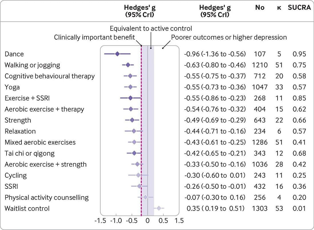 ТЕЛЕГРАМ КАНАЛ ПСИХОЛОГИИ - приглашаю Австралийские и испанские ученые провели недавно (свежее - 2024 год публикация) метаанализ (218 уникальных исследований с более чем 14 000 респондентами) исследований снижения депрессии и выяснили, что самый эффективный метод снижения симптомов депрессии - танцы. И вот 10 работающих методов снижения симптомов депрессии: 1️⃣Танцы 2️⃣Ходьба или бег 3️⃣Когнитивно-поведенческая терапия (КПТ) 4️⃣Йога 5️⃣Упражнения + антидепрессанты (SSRI) 6️⃣Аэробные упражнения + терапия 7️⃣Силовые тренировки 8️⃣Релаксационные техники 9️⃣Тайцзи или цигун 🔟Смешанные аэробные упражнения Собственно терапия только на третьем месте. Антидепрессанты только с упражнениями. Ну мне танцевать не с кем, я хотя бы хожу. И кстати, а где секс? Неужели не снижает депрессию? ТЕЛЕГРАМ КАНАЛ ПСИХОЛОГИИ - приглашаю См. также Корреляция IQ и смертность в ДТП Продолжительность нашего внимания не фиксирована. Она увеличивается с практикой Дети, которые регулярно выполняют работу по