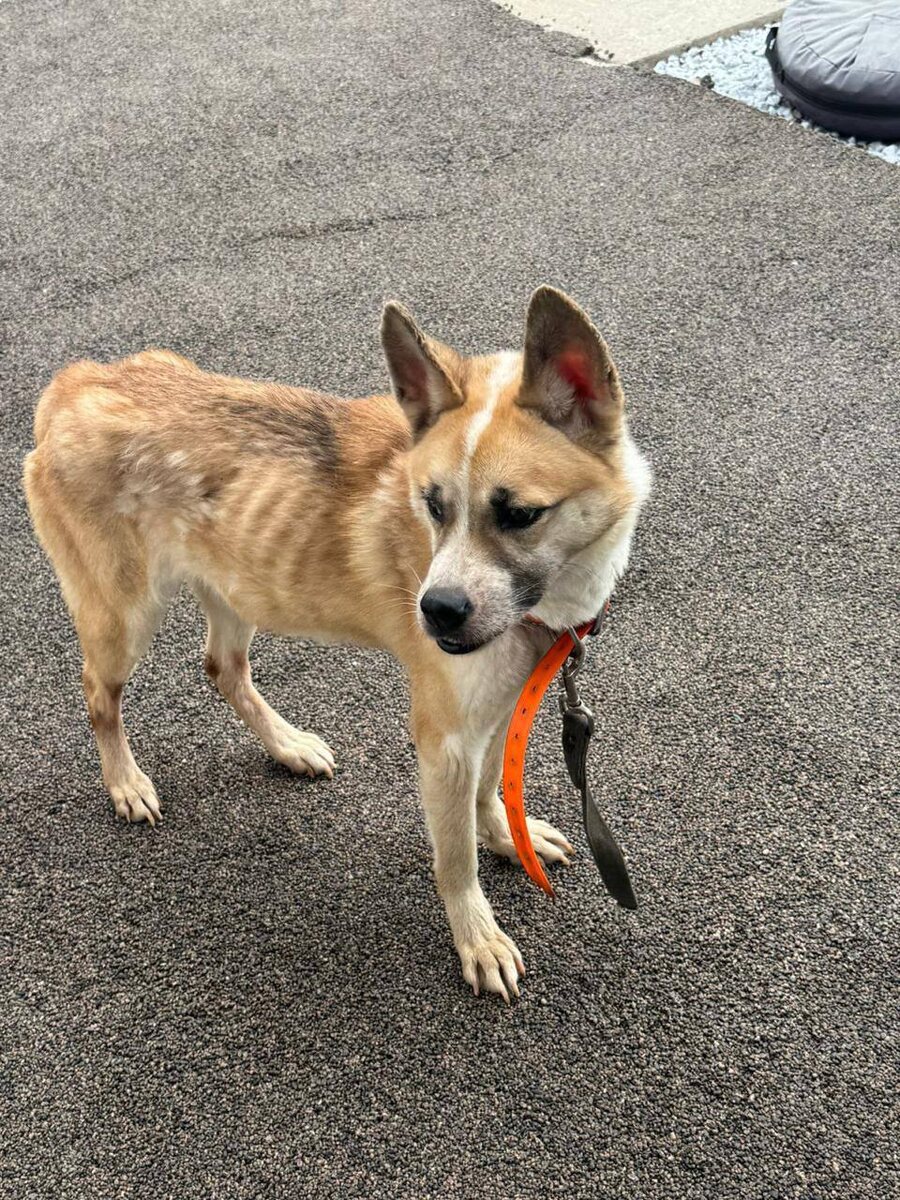 ⚠️ Найдена собака 📍 МО Пушкинский район Левково 10.05.2025 Найдена сильно худая собака Окрас рыжий с белым, небольшая Ошейник оранжевый с