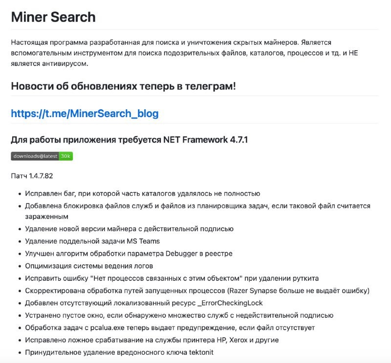 😎 СНОСИМ МАЙНЕРЫ С КОМПА — нашли мастхэв-тулзу Miner Search для тех, кто любит торренты, но не любит сюрпризы в виде скрытых майнеров! — Пролезет по всем файлам и реестру, вытащит даже глубоко спрятанные вирусы. — Удаляет майнеры полностью, без остатков. — Установка максимально простая — справится даже школьник. — Требуется только .NET Framework 4.7.1. — И главное — БЕСПЛАТНО! Ставим в пару к антивирусу — и спим спокойно. Что думаешь по этому поводу? Пиши в комменты! #полезно | ВСЁ ПРО AI | AI NEWS | Дзен | ОК