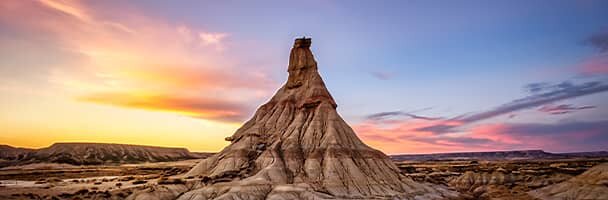 В самом сердце Барденас-Реалес в Наварре, уникального ландшафта полупустыни в Испании, возвышается Кастильдетьерра, самое культовое скальное образование в этом районе. Его силуэт, напоминающий природную башню, разрушенную ветром и водой, является символом этой территории, объявленной ЮНЕСКО биосферным заповедником. Барденас-Реалес, бывшие земли короны Наварры, занимают более 41 000 гектаров живописных ландшафтов. Их глинистые, гипсовые и песчаниковые почвы формировались веками, образуя овраги, плато и поразительные горные образования. Здесь нет городских центров, только необъятная природа в ее первозданном виде. Посетив это место, вы словно попадаете в другой мир. Исследуя его тропы пешком, на велосипеде или на автомобиле, вы сможете открыть для себя его суровую красоту и богатую дикую природу, в которой обитают хищные птицы, такие как белоголовый гриф. Кроме того, его кинематографический облик послужил декорацией для сериалов и фильмов. Если вы ищете уникальное место в Испании, то Ба