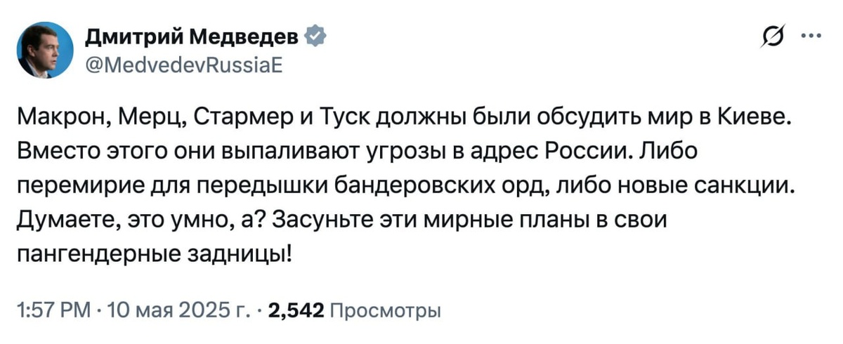 Дмитрий Медведев резко отреагировал на встречу лидеров Европы и США с президентом Украины Зеленским, назвав её провокационной. В своём заявлении он использовал жёсткий язык, говоря: «Засуньте эти планы в свои пангендерные задницы!», подчеркнув, что вместо мирных инициатив со стороны западных стран звучат угрозы в адрес России. По мнению Медведева, предложенные идеи о 30-дневном прекращении огня — не шаг к миру, а передышка для Вооружённых Сил Украины. Он отметил, что такие предложения носят избирательный характер и направлены исключительно на усиление позиции Киева. Ранее Зеленский, Макрон, Мерц, Стармер и Туск обсуждали с Дональдом Трампом возможность временного перемирия, что вызвало критические комментарии со стороны Москвы. Россия продолжает называть западные инициативы лицемерными и считает их недостаточными для достижения реального политического урегулирования.