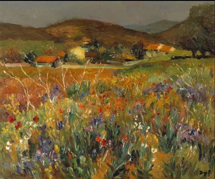 На картине «Поле цветов в Провансе» художника Марселя Дифа изображены яркие цветы на фоне холмов.