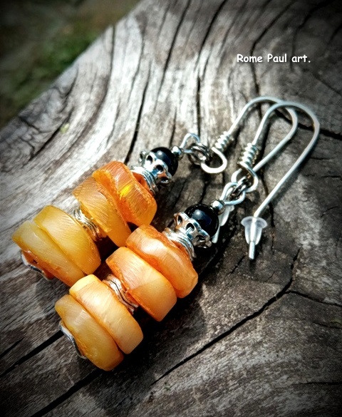 Материалы: натуральный дикий янтарь (ручная огранка, 4*12 мм, Балтийское море), чёрный агат-халцедон (6\8 мм, Бразилия), родированная фурнитура, ювелирный мельхиор