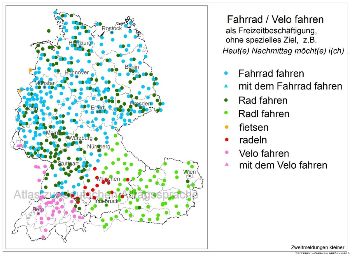 У страха глаза вéлики 🚲 Недавно мы собирали глоссарий по велосипедам и вот задумались: ведь в немецком сказать, что ты едешь на велосипеде можно по-разному. А от чего зависит выбор варианта? Как всегда: от региона! ◀️ Почти по всей Германии – Fahrrad fahren или Rad fahren. Это в целом равнозначные варианты. ◀️ Бавария и Австрия говорят: Radl fahren. С типичным для южно-немецкого диалекта суффиксом -l. ◀️ Ещё отдельный кусочек Баварии – radeln. От того же самого Radl, южно-немецкого синонима к Fahrrad. ◀️ И, наконец, Швейцария – Velo fahren. А Velo – это уже почти что вéлик 🚴♂️ 💡 Как всегда просим вас сверить карту с вашими наблюдениями. Пишите регион и то, как у вас говорят про велосипеды! Можете даже прислать фотографии вашего любимого Radweg'а. 🔡 Учиться с нами