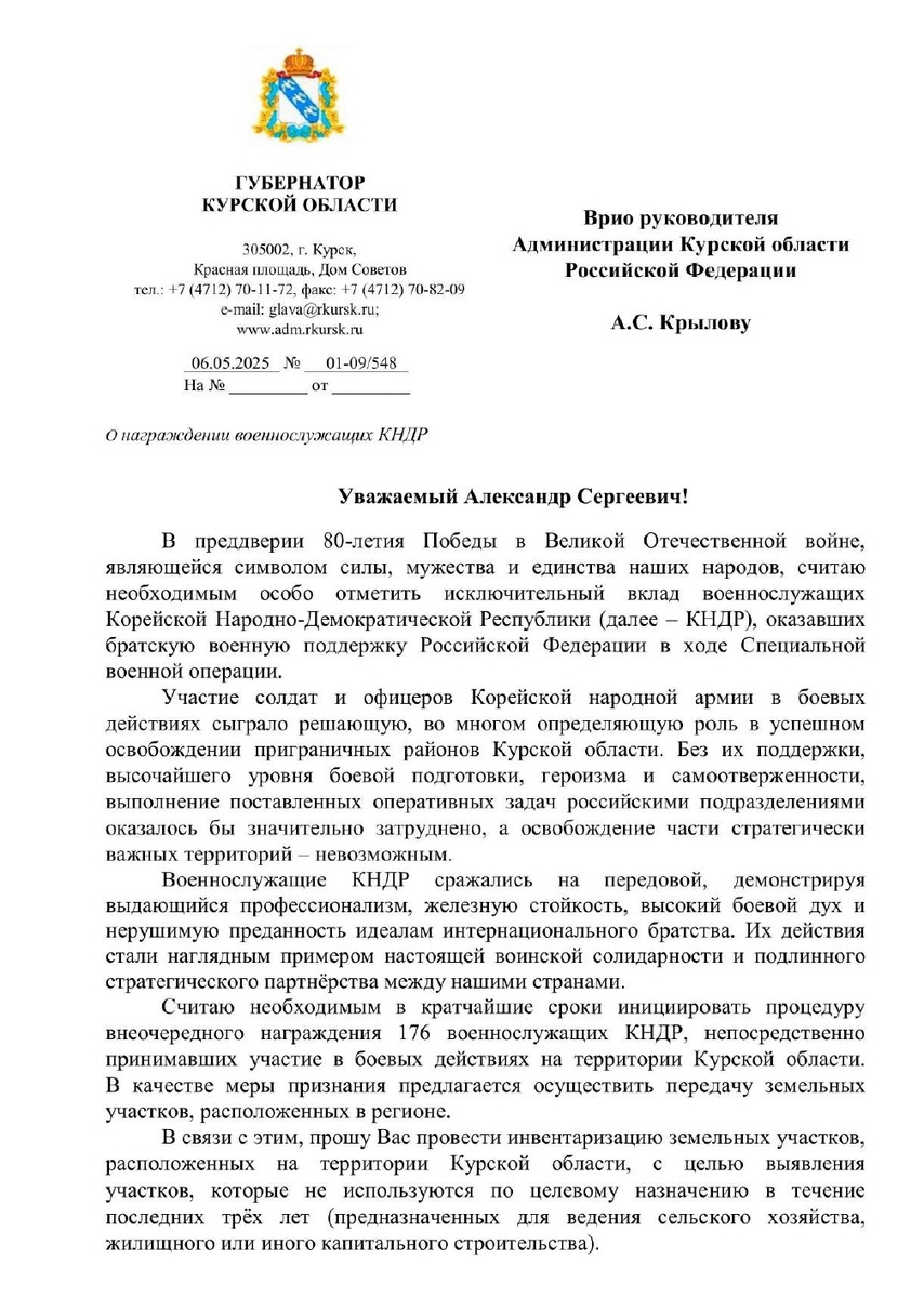 В сети распространилась информация, что врио губернатора Курской области А.Е. Хинштейн предложил наградить 176 военнослужащих КНДР за участие в боевых действиях в регионе в рамках СВО. Инициатива якобы приурочена к 80-летию Победы в Великой Отечественной войне и направлена на признание вклада Корейской народной армии. Сообщалось, что военнослужащие КНДР сыграли ключевую роль в освобождении приграничных районов Курской области, обеспечив успех российских подразделений. Без их поддержки выполнение задач было бы затруднено. В качестве награды предлагалась передача военнослужащим КНДР земельных участков в Курской области, изъятых у граждан РФ после инвентаризации неиспользуемых земель, включая сельскохозяйственные и строительные территории. Позже администрация Курской области опровергла эту информацию, заявив, что инициатива не выдвигалась, а слухи основаны на неподтвержденных публикациях в сети. Однако местные жители считают, что власти могли распространить эти слухи для проверки обществ