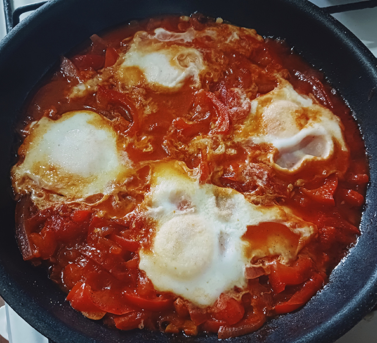 и 80-100мл сока - Оливковое масло для жарки - 20 мл - Красный лук - 1 шт - Чеснок - 2 зубчика - Куриные яйца - 4 шт - Красный болгарский перец - 1 шт - Соль, черный молотый перец - по вкусу - Чили соус - по вкусу 1. Нарезаем лук полукольцами. 2. Нарезаем чеснок на пластинки. 3. Болгарский перец нарезаем соломкой. 4. Обжариваем лук и чеснок 2-3 мин на среднем огне. 5. Добавляем в сковороду болгарский перец. Солим и перчим по вкусу. 6. Обжариваем овощи 2-3 мин на среднем огне. 7. Добавляем консервированные помидоры (300гр), сок (80-100мл) и соус чили по вкусу. 8. Перемешиваем, накрываем крышкой и тушим 2-3 минуты. 9. Делаем 4 углубления и выкладываем в каждое по яйцу. 10. Накрываем крышкой и томим на среднем огне 6-8 минут. Если понравилась статья или было полезно, поставьте лайк и подпишитесь на канал - ПОДПИСАТЬСЯ
