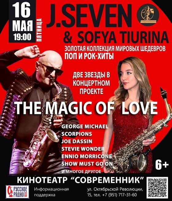 🎷В Смоленске пройдёт концерт виртуозных саксофонистов Две звезды J.Seven&Sofya Tiurina - в уникальном концертном проекте "The Magic of Love". Смолян и гостей города приглашают 16 мая в 19:00 в кинотеатр «Современник». «Их музыка лечит души...». Такими метафорами характеризуют концерты виртуозных саксофонистов, ведь здесь зрители погружаются в эйфорию и наслаждаются красотой звучания самого романтичного инструмента, который говорит и поёт в руках уникальных артистов, чувствуя и переживая эмоции добра, любви и романтики. А концерты неизменно вызывают подлинный интерес всех меломанов и особенно любителей романтической саксофонной музыки. В репертуаре: George Michael, Joe Dassin, Stevie Wonder, Ennio Morricone, Scorpions, Show Must Go On и многое другое. Приходите, чтобы ощутить магию любви! Стоимость билетов от 800 рублей. 👀 Успейте занять лучшие места: https://golnk.ru/qrBzz Реклама ООО «Корпорация инвестиционного развития Смоленской области» 2SDnjeBUTVE Афиша и видео предоставл