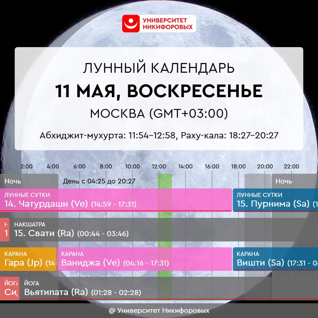 11 МАЯ, ВОСКРЕСЕНЬЕ Жесткие энергии дня, в них много силы, но ее сложно направить в созидательное русло. Поэтому этот выходной стоит либо посвятить очищению своего внутреннего и внешнего пространства, либо просто отдыхать. Эмоционально мы можем ощущать себя не очень спокойно, особенно ближе к вечеру – с 17:31 начинается полнолуние. Лунной энергии сейчас в избытке, а когда что-то находится в избытке, то это далеко не всегда хорошо. День может потребовать от нас большей гибкости с окружающими, чем обычно – пусть это не переходит грань ваших личных границ и не будет в ущерб себе. Не колебайтесь задать себе внутренне вопрос “а как это для меня?” и дать ему какое-то время на существование, взвесить все за и против из прошлого и настоящего.