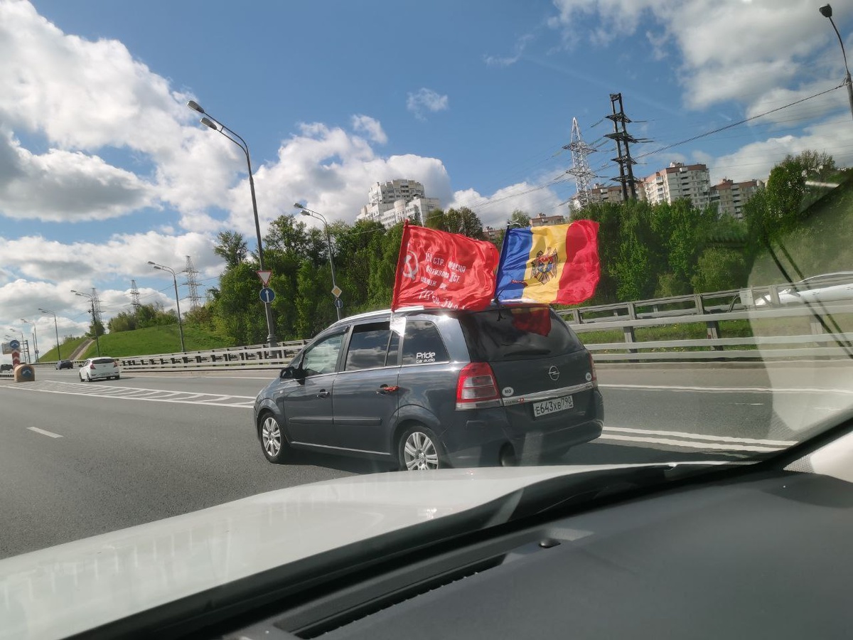 Вчера в Москве, на МКАД, по дороге на праздничные мероприятия, заметил несколько празднично украшенных автомашин с флагами Победы, России, СССР и... Молдовы!