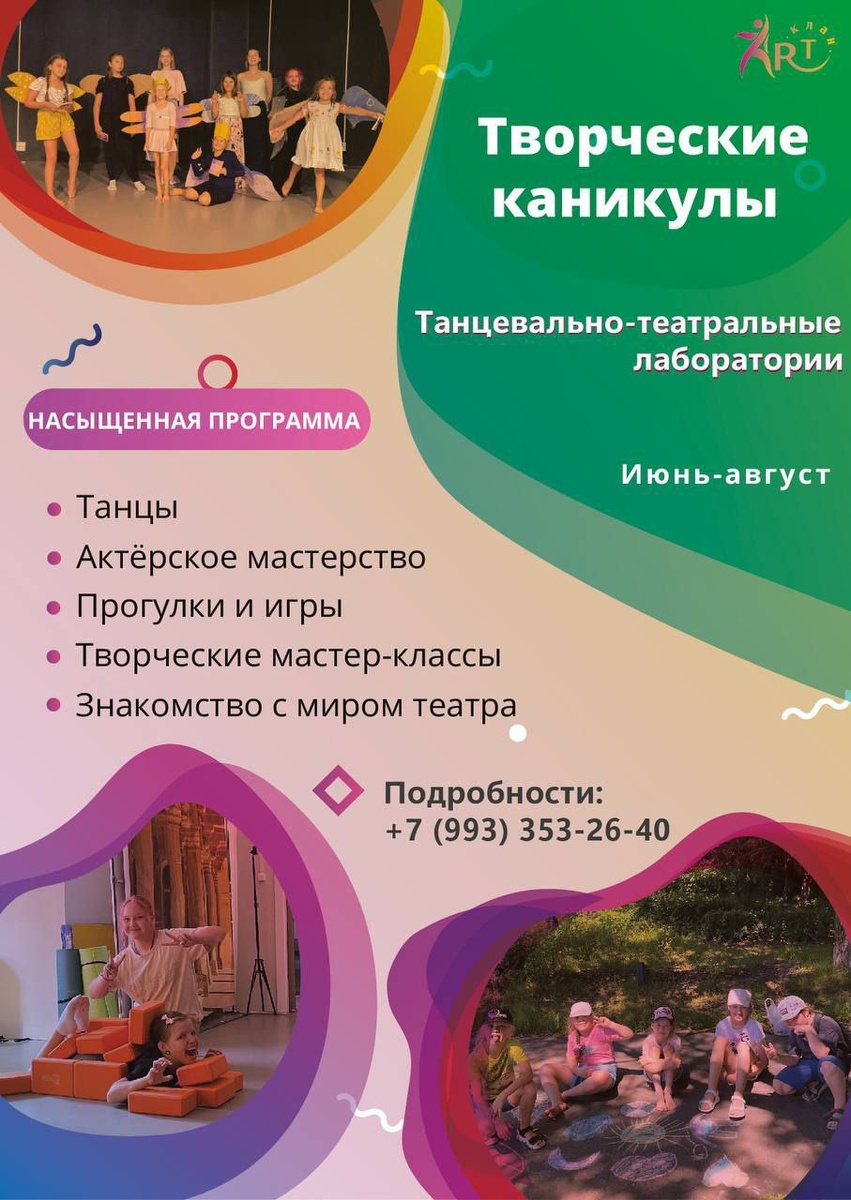 ☀️ Лето — время для новых ярких впечатлений и творческих открытий! Приглашаем ваших детей (7-13 лет) в детский городской лагерь «Танцевально-театральные лаборатории» ✨ Двухнедельные смены проходят по будним дням с 10:00 до 16:00 В программе: ✅Увлекательные занятия актерским мастерством и танцами ✅Творческие мастер-классы ✅Лекции и фильмы о мире театра ✅Прогулки и игровые активности Вкусные обеды включены в стоимость, чтобы энергии хватило на весь день! 🎭 Это отличная возможность для детей развить творческий потенциал, научиться новым навыкам и просто интересно провести лето, а не сидеть дома за телефонами. Ребята не только познакомятся с искусством театра и танца, но и обретут новых друзей, узнают что-то новое и проведут время с пользой для души и тела! 🌈 Одно из главных преимуществ — это возможность провести лето в творческой атмосфере, наполненной вдохновением и позитивом. Наш лагерь идеально подходит для тех, кто хочет открыть в себе новые таланты и получить яркие воспоминани